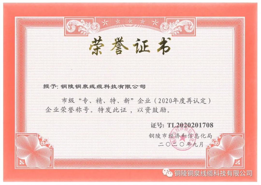 經(jīng)過層層評(píng)比,近日,銅泉公司通過了2017年度市級(jí)專精特新企業(yè)復(fù)核認(rèn)定!此次的復(fù)核通過再次證明了銅泉線纜在市場、質(zhì)量、效益、發(fā)展等方面的先進(jìn)性和示范性,更是對(duì)我公司在“專業(yè)化、精細(xì)化、特色化、創(chuàng)新化”等方面所做努力的高度肯定。